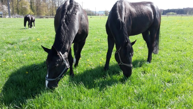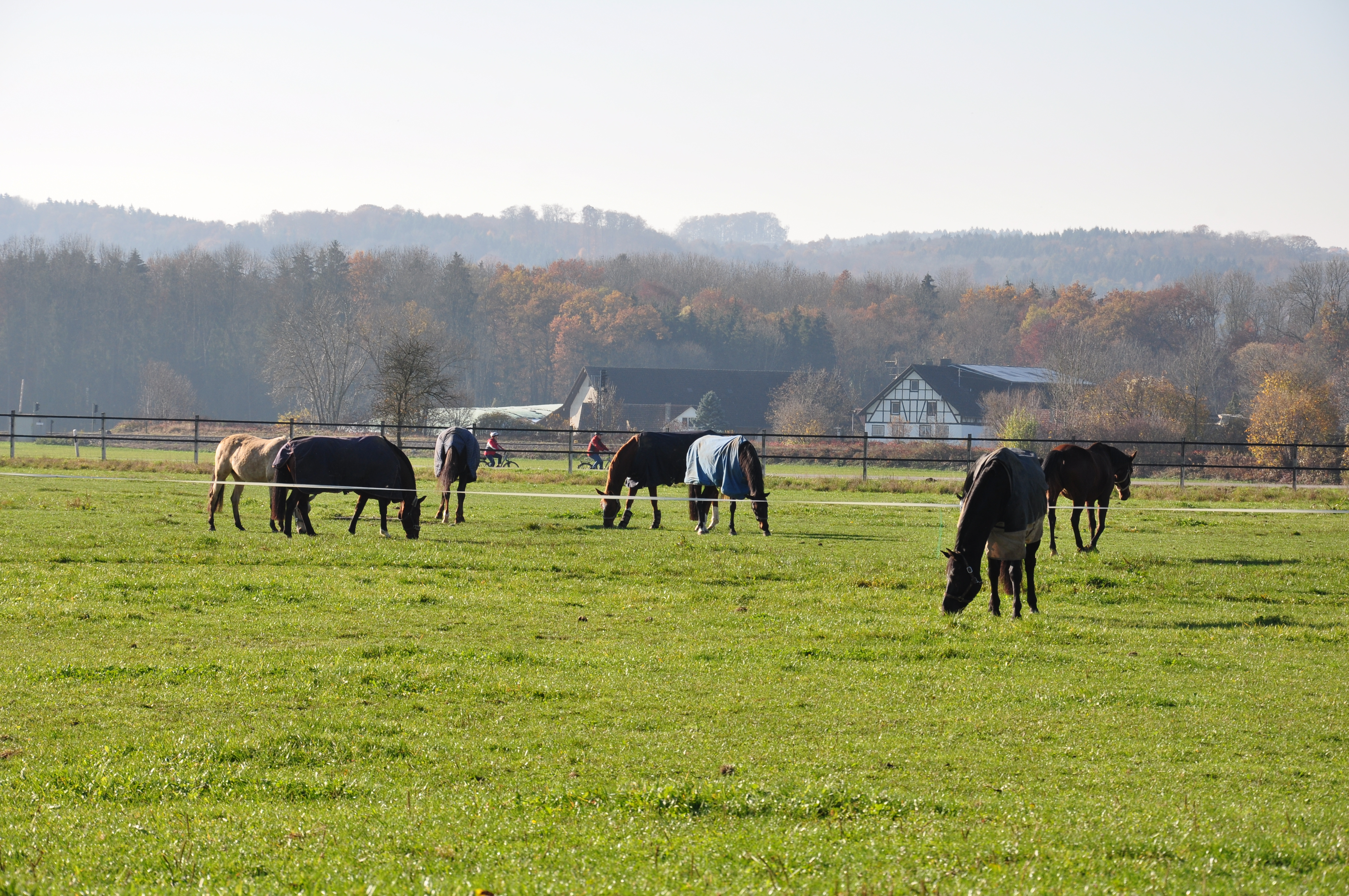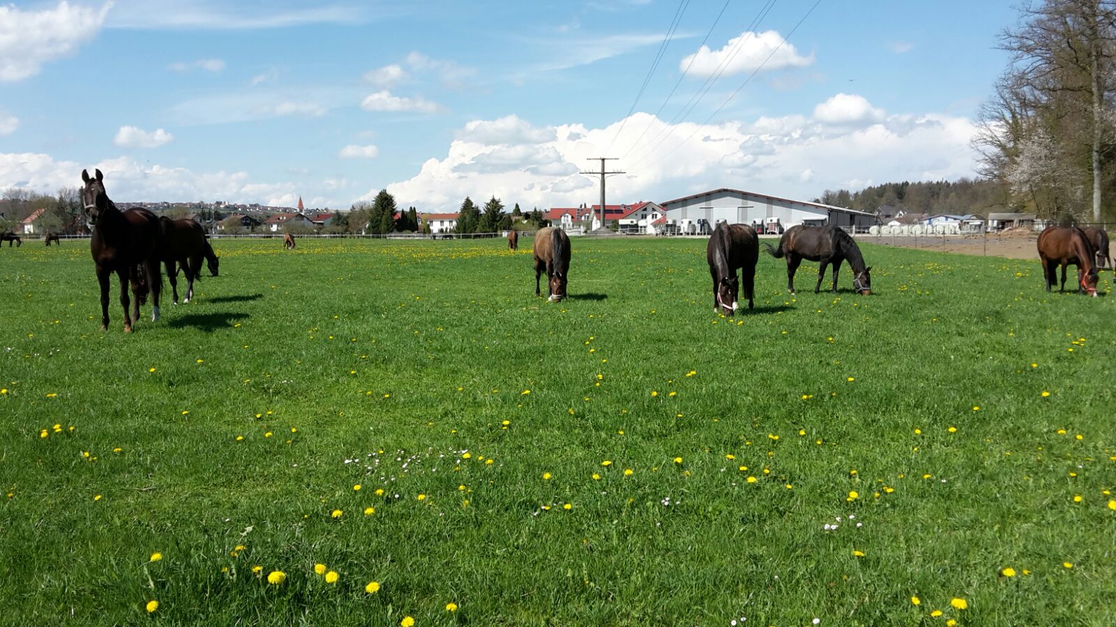 - täglicher Weide- oder Paddockgang (je nach Wetterlage) in Wallach- und Stutengruppen. Pferde werden an der Hand geführt!