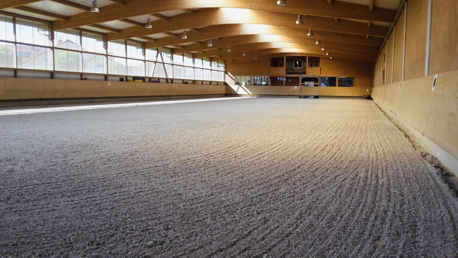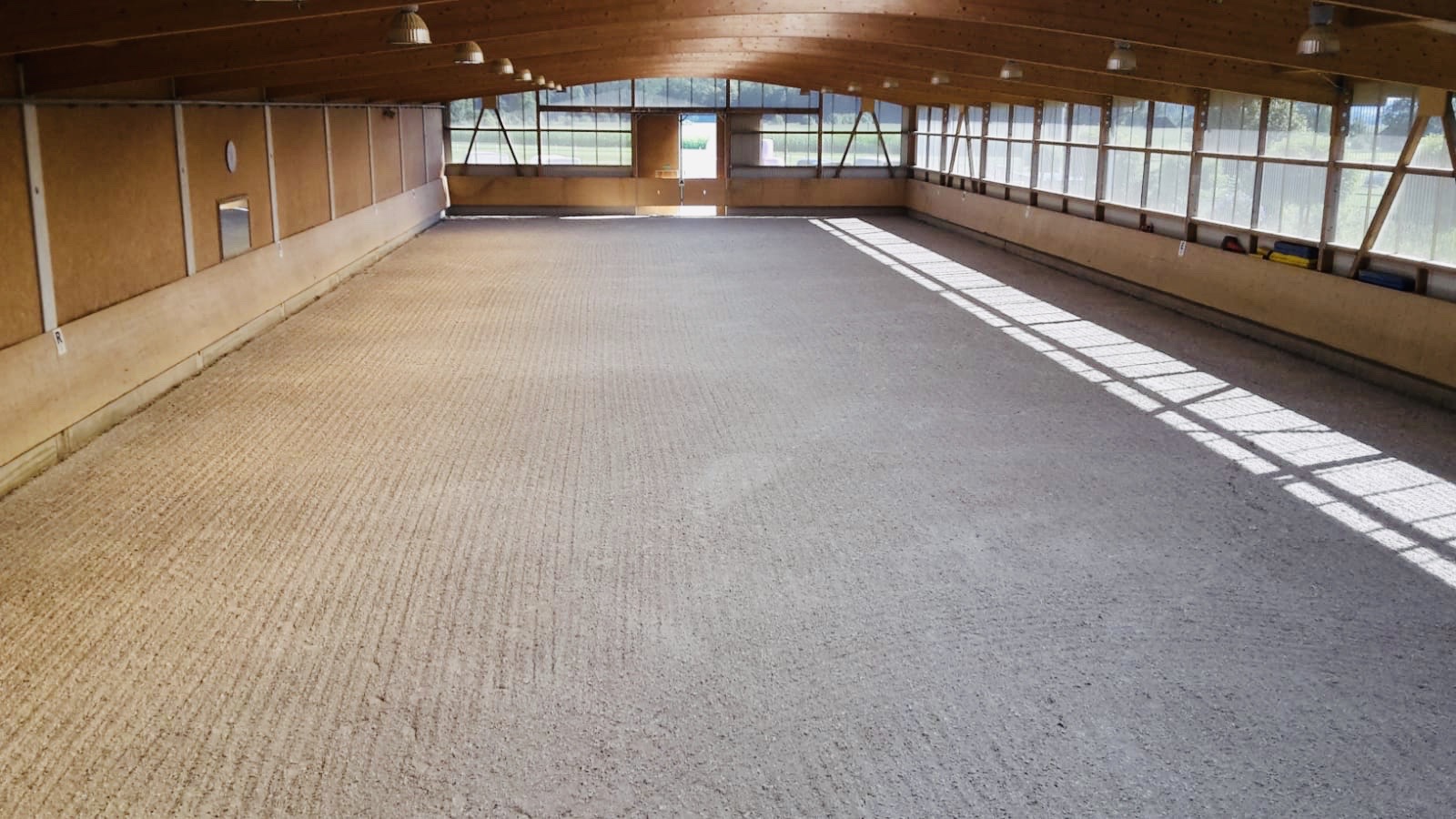 Unsere Anlage verfügt über eine luftige, lichtdurchflutete Reithalle und zwei Außenreitplätze. Unsere Reithalle und unser großer Außenreitplatz wurden mit hochwertigen Terra-Tex-Reitböden ausgestattet.